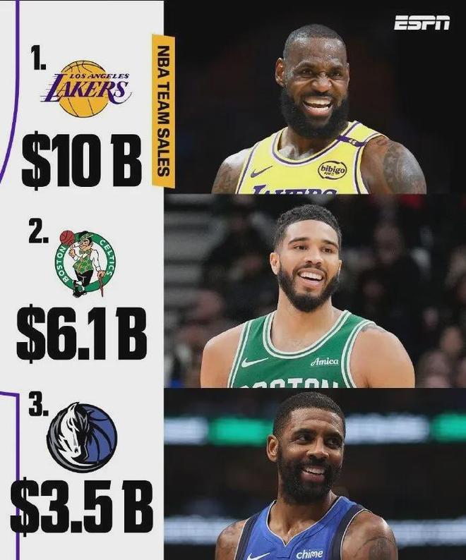 近年來(lái)NBA掀起了賣(mài)隊潮,湖人之前,凱爾特人以61億美元出售給由Symphony Technology Group聯(lián)合創(chuàng )始人比爾-奇澤姆領(lǐng)銜的投資集團,獨行俠以35億美元出售給阿德?tīng)柹易宓鹊取?/p>