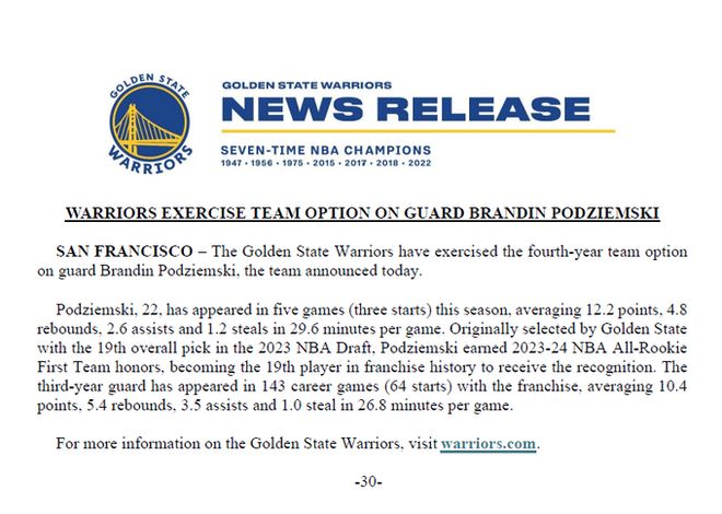 在截止日期到來(lái)前,這一操作被認為是必然結果。此舉將鎖定波杰姆斯基新秀合同第四年(即最后一年)的薪資,金額為5679458美元。若他與勇士隊未能在2026年休賽期達成提前續約,他將在2027年成為受限制自由球員;目前他已具備獲得新秀合同提前續約的資格。
